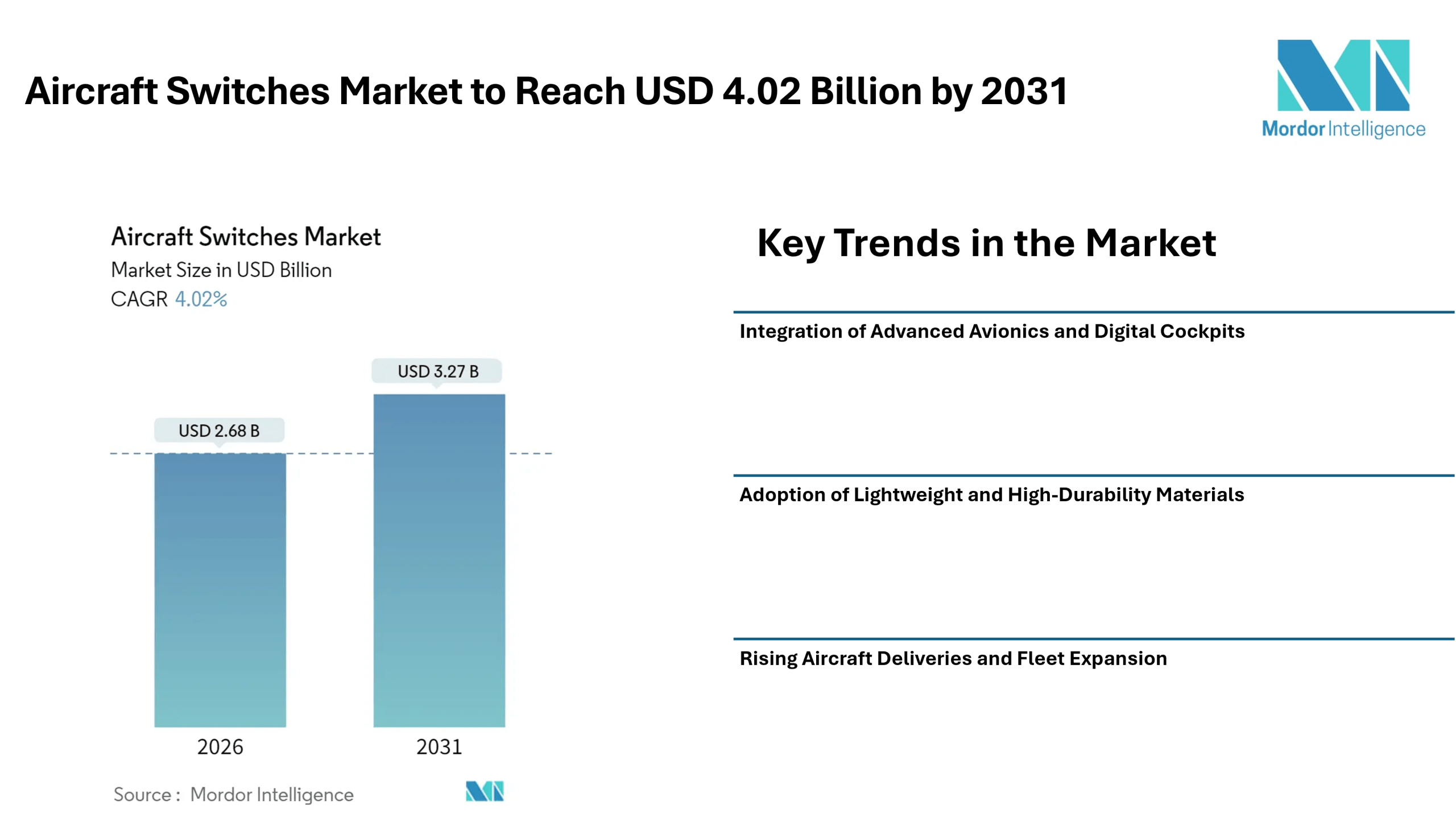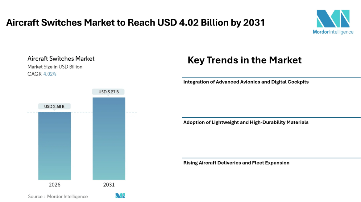 Home PRESS RELEASESAircraft Switches Market to Reach USD 4.02 Billion by 2031, Supported by Advanced Avionics Integration and Rising Aircraft Production – Mordor Intelligence