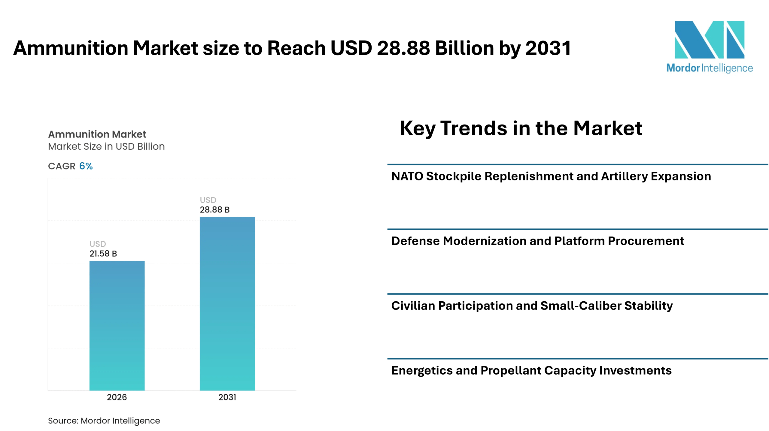 According to Mordor Intelligence, the ammunition market size is expected to grow from USD 21.58 billion in 2026 and is forecasted to reach USD 28.88 billion by 2031, registering a CAGR of 6.00% during the forecast period. Sustained defense procurement programs, artillery stockpile rebuilding initiatives, and modernization plans across allied nations are supporting ammunition market growth.
