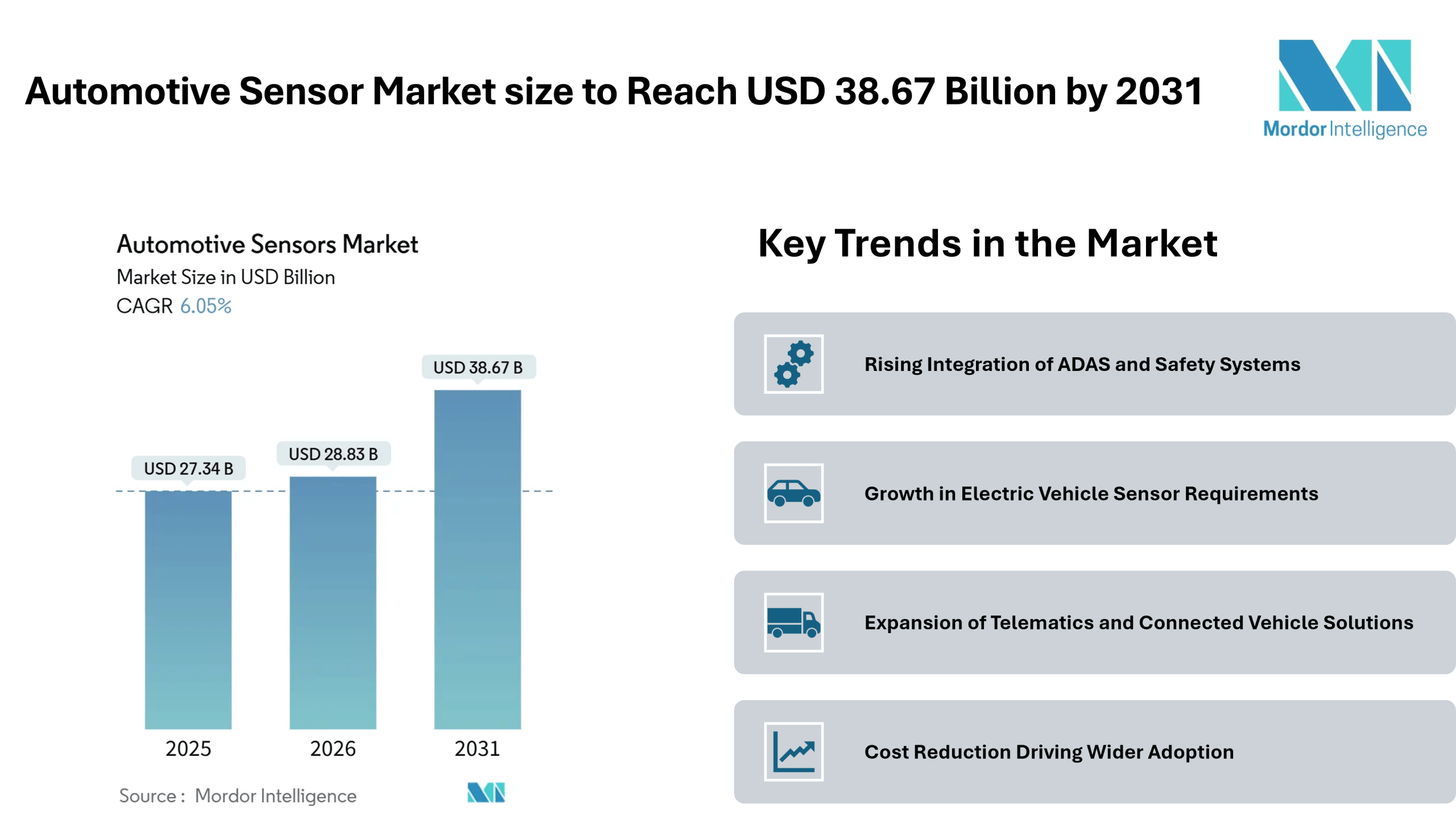 According to Mordor Intelligence, the automotive sensor market size was valued at USD 27.34 billion in 2025 and is estimated to grow to USD 28.83 billion in 2026, reaching USD 38.67 billion by 2031, registering a CAGR of 6.05% during the forecast period. This steady automotive sensor market growth reflects the increasing integration of sensors across modern vehicles, where safety, efficiency, and connectivity are becoming standard expectations rather than premium features.