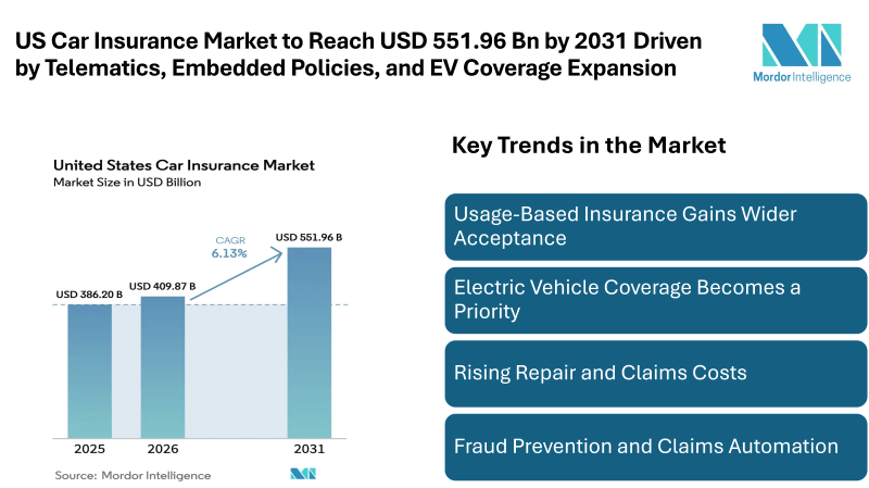 US Car Insurance Market to Reach USD 551.96 Billion by 2031 Driven by Telematics, Embedded Policies, and EV Coverage Expansion